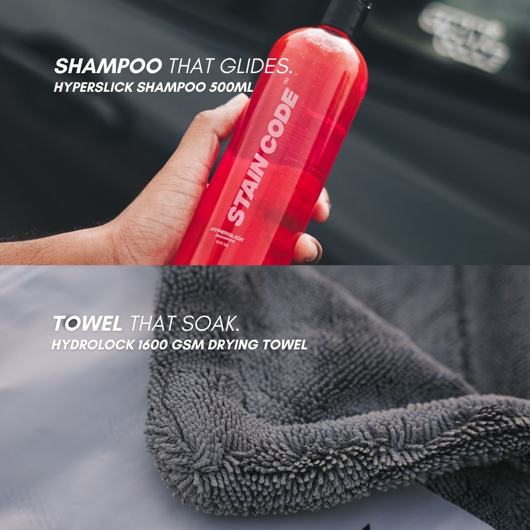 Meet the Ultimate Weekend Wash Combo from Stain Code™ — a car wash kit designed for enthusiasts and automotive lovers who take pride in keeping their machines flawless. Inside, you’ll find our foam-rich, high-lubrication Hyperslick Car Shampoo, perfect for a swirl-free hand wash, and the Hydrolock 1600 GSM Microfiber Drying Towel for a fast, streak-free finish.